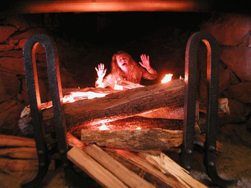 Amy Camping it Up in the Oversized Grove Park Inn Fireplace - Photo by Kathy McCabe